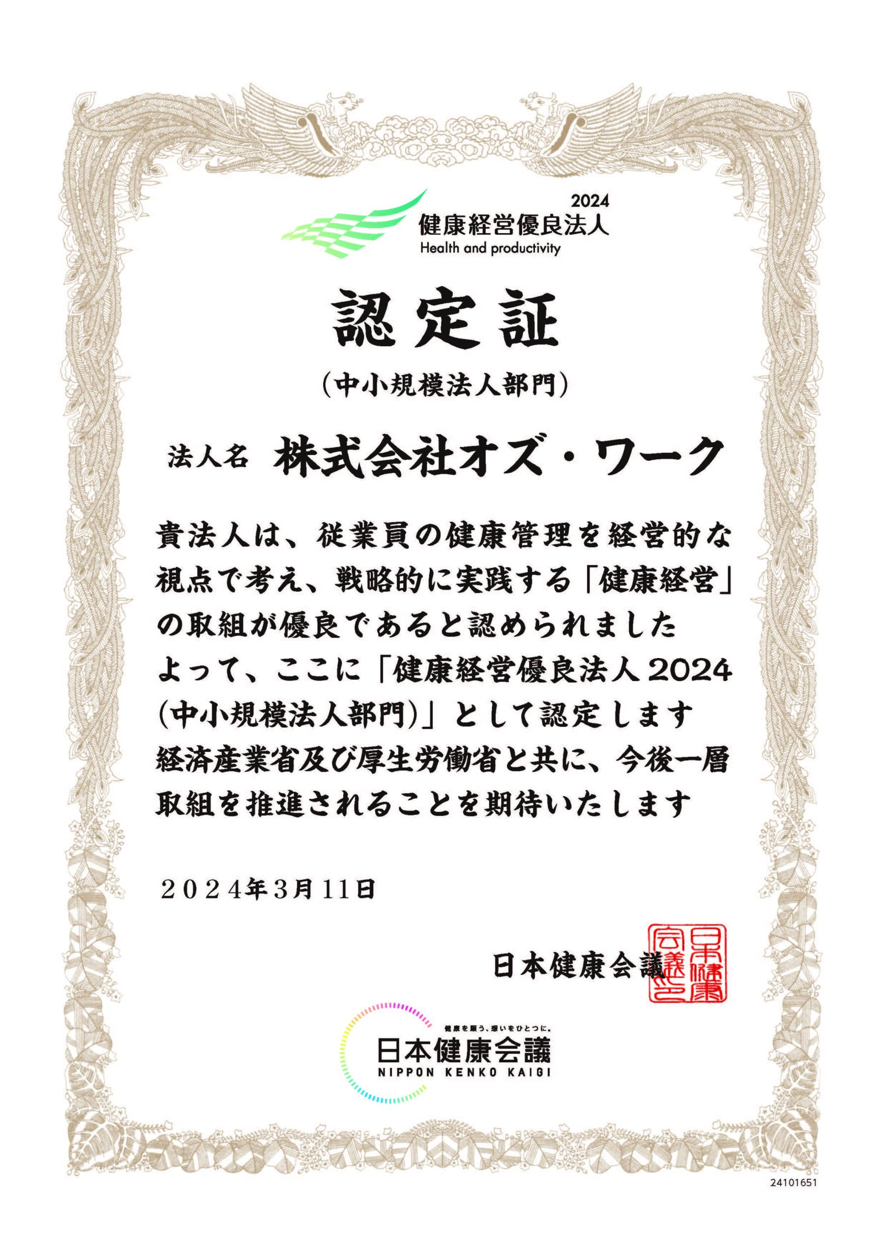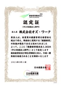 2024年3月11日付で、経済産業省が創設した健康経営優良法人認定制度において、本制度を運営する日本健康会議より、 『健康経営優良法人2024(中小規模法人部門)』に2019年より6年連続で認定されましたことをお知らせいたします。